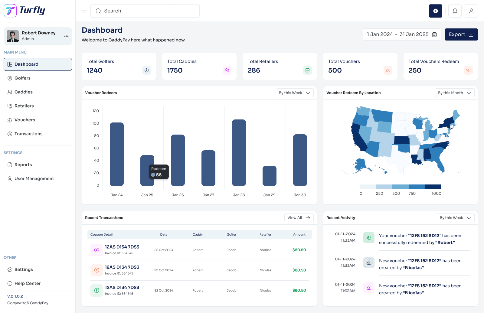 The dashboard was designed around one principle: an admin should understand the health of the platform the moment they land. Four KPI cards surface total golfers, caddies, retailers, and voucher activity. A bar chart shows redemption trends over time. A US geographic heat map reveals where activity is concentrated. Recent transactions sit below for quick scanning.